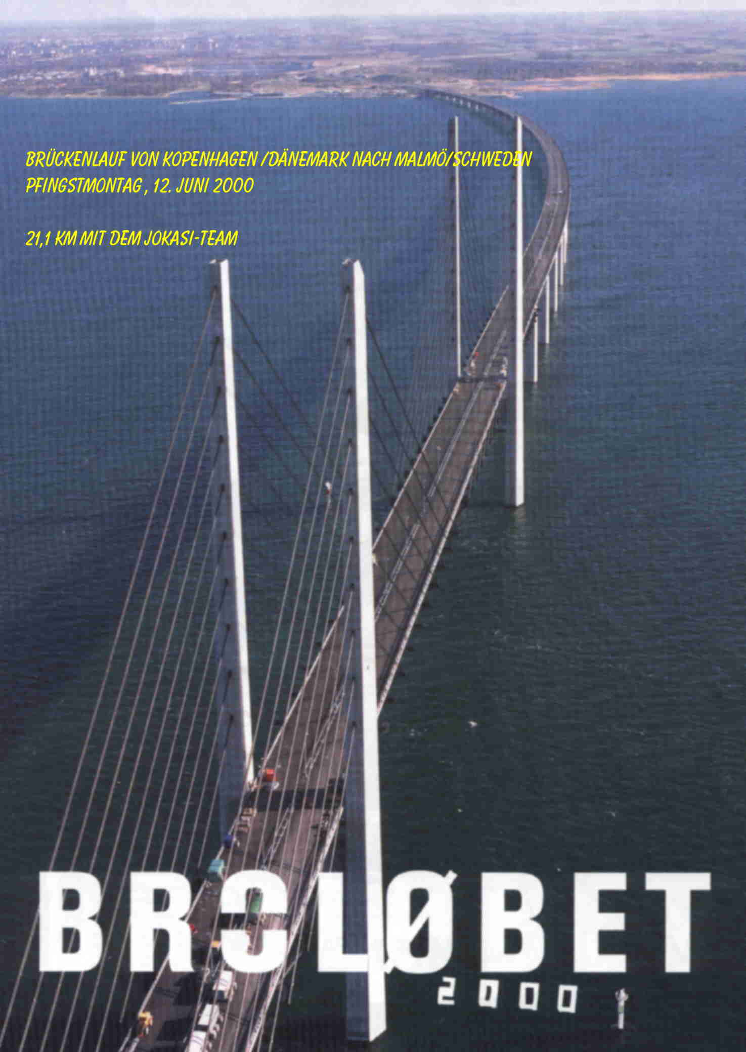 | Pfingstmontag,den 12. Juni 2000. Fast 100.000 Läuferinnen und Läufer aus der ganzen Welt wollen über die neue Øresundsbrücke von Kopenhagen/Dänemark nach Malmö/Schweden laufen. Die Strecke beträgt 21,1 Km, ein Halbmarathon. Die ersten 4,5 Km werden durch einem Tunnel 20 m unter der Wasseroberfläche zurückgelegt. Dann geht es 4 Km über die künstlich aufgeschüttete Insel Peberholm, dann über die 8 Km lange Øresundsbrücke, die erst am 1. Juli offiziell eröffnet wird. Zum Abschluss geht es noch etwa 5 Km durch Malmö/Schweden zum Ziel. |